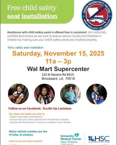 Acadiana Safe Kids thrives on the power of community partnerships and volunteer support. Throughout the year, we host and participate in community events, safety fairs, car seat checks, and educational workshops to raise awareness about child safety topics such as Safe Sleep, Water Safety, and Passenger Safety. There are many ways to get involved—volunteer at events, share educational materials, become a community partner, or donate resources to support our programs. Every contribution, big or small, helps us reach more families and protect more children across Acadiana. Together, we can build a stronger, safer community where every child grows up safe and healthy.