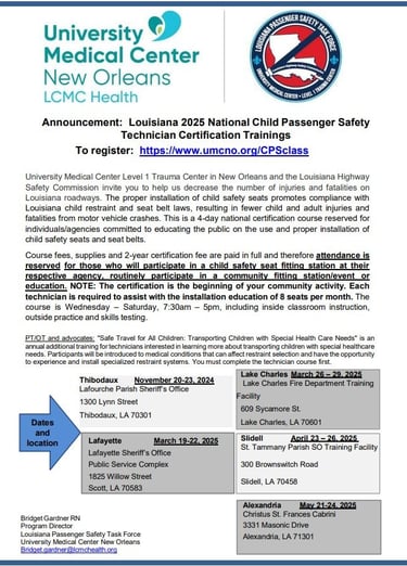 Joining Acadiana Safe Kids as a partner is a meaningful way to help keep children in our community safe. Organizations, businesses, and individuals can support our mission by sharing safety resources, hosting educational events, volunteering, or providing funding or in-kind support. Partners help us expand programs like Safe Sleep, Water Safety, Car Seat Safety, and Injury Prevention, making a real difference in the lives of children and families. By working together, we can create a safer environment for every child in Acadiana. To learn more about partnership opportunities, reach out to our team and join us in promoting child safety!